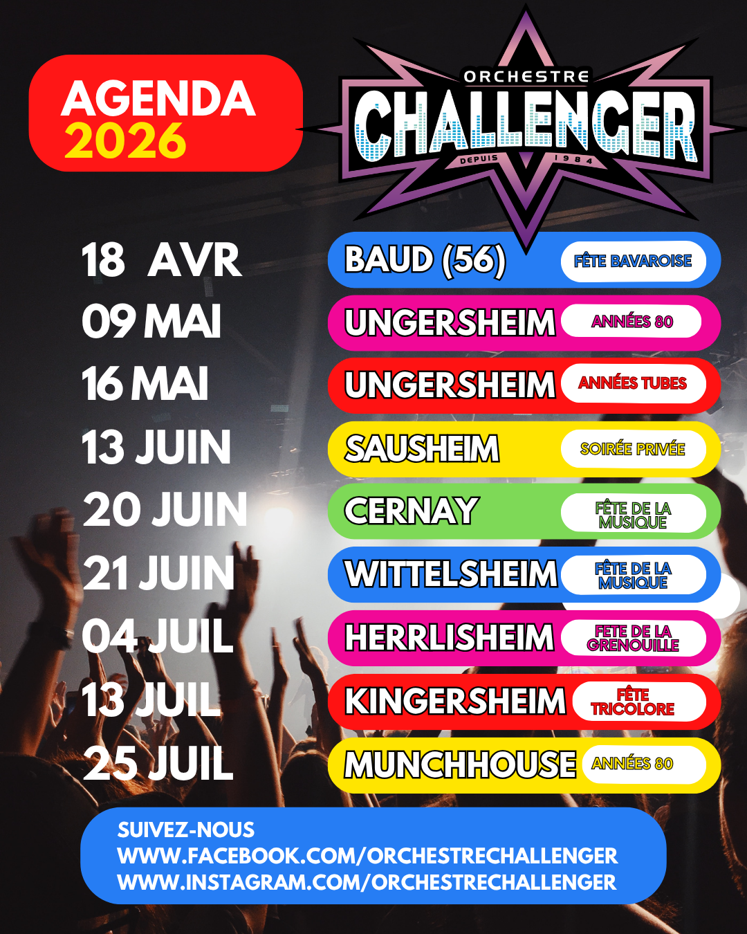 groupe CHALLENGER Orchestre de variété 100 % musique – 100% ambiance – 200% CHALLENGER Grand orchestre de variété | Pour une ambiance de folie Suivez-nous Nos prochains rendez-vous Facebook Orchestre CHALLENGER - page officielle 4 jours Video Orchestre CHALLENGER - page officielle 6 jours Photos de la publication de La Grande fête Bavaroise ... plusmoins Orchestre CHALLENGER - page officielle est à Au Bon Vieux temps. 7 jours 🍴😋 ... plusmoins Au Bon Vieux temps facebook.com Orchestre CHALLENGER - page officielle 7 jours 🚌 Et dernier trajet pour aujourd'hui : Auray - BaudLa Grande fête Bavaroise on arrive 🤩 ... plusmoins Orchestre CHALLENGER - page officielle 7 jours Ça devient bon 😉 ... plusmoins Photo Envoyez nous un message Envoyez nous un message Nom Adresse e-mail Message 5 + 4 = Envoi Contactez-nous