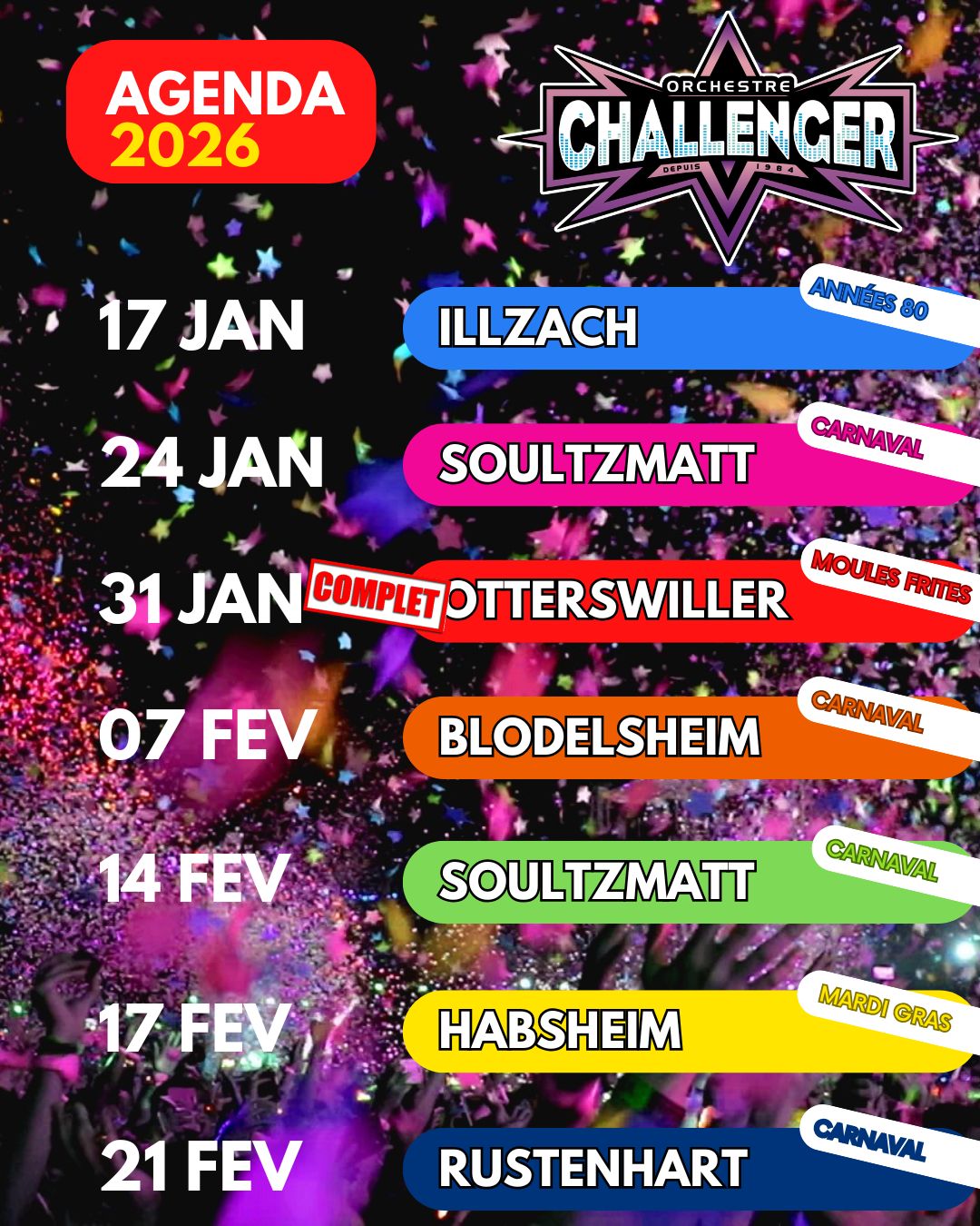 groupe CHALLENGER Orchestre de variété 100 % musique – 100% ambiance – 200% CHALLENGER Grand orchestre de variété | Pour une ambiance de folie Suivez-nous Nos prochains rendez-vous Facebook Orchestre CHALLENGER - page officielle 18 heures j-3 🤩Pensez aux préventes à prix réduit 😉 ... plusmoins Photo Orchestre CHALLENGER - page officielle 5 jours 2026 : CHALLENGER fait son carnaval 🎉24-01 : SOULTZMATT07-02 : BLODELSHEIM14-02 : SOULTZMATT17-02 : HABSHEIM21-02 : RUSTENHART22-02 : RUSTENHART29-02 : RUSTENHART01-03 : RUSTENHART07-03 : ROUFFACH14-03 : RIESPACH21-03 : RIESPACH ... plusmoins Photo Orchestre CHALLENGER - page officielle 5 jours ⚠️ Préventes à prix réduit : ... plusmoins Soirée Challenger année 80 www.helloasso.com Orchestre CHALLENGER - page officielle 5 jours J-7 avant notre 1er rdv de l'année ! ... plusmoins Photo Orchestre CHALLENGER - page officielle 2 semaines Et c'est parti pour une nouvelle année de folie 🤩Nos rdv de janvier :>> samedi 17 à ILLZACH | soirée ANNÉE 80PREVENTE : www.helloasso.com/associations/societe-de-gymnastique-d-illzach/evenements/soiree-challenger-anne...>> samedi 24 à SOULTZMATT | Bal de carnaval⚠ début du bal à 20h00>> samedi 31 à OTTERSWILLER | soirée moules frites⚠ COMPLET ⚠ ... plusmoins Photo Envoyez nous un message Envoyez nous un message Nom Adresse e-mail Message 14 + 12 = Envoi Contactez-nous
